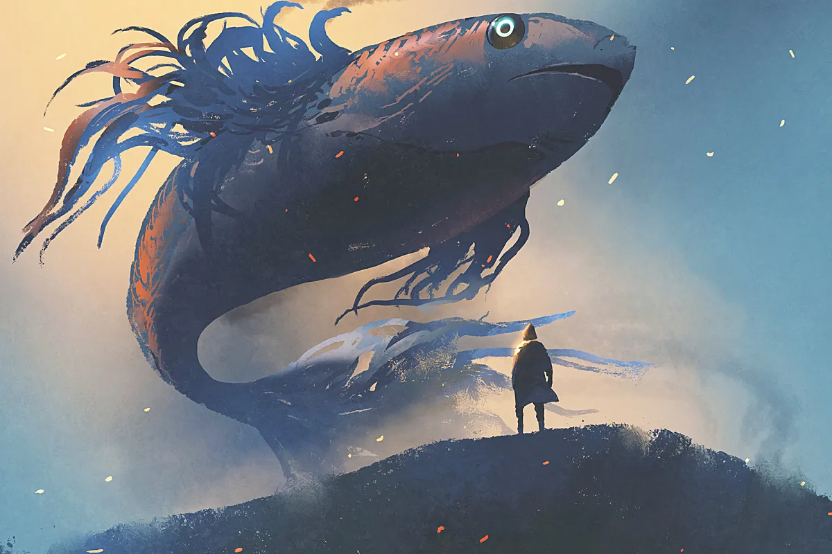 巨大的鱼漂浮在天空中,黑色斗篷中的人插图,版权来自Deposit Photos