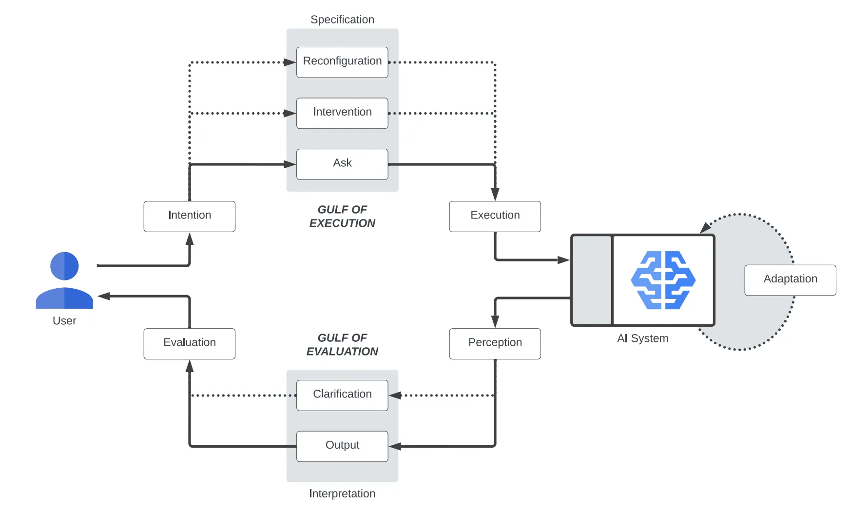 Desolda 及其研究团队基于 Norman 的“执行鸿沟”和“评估鸿沟”模型,捕捉到了这种动态变化。与直接操作不同的是——比如拖动文件到文件夹,操作是逐步展开的——AI 交互需要更加流畅、迭代的过程。用户提出目标,而不是逐步执行每个操作,而是与系统协作,优化输入,引导 AI 动态解读、调整和响应。