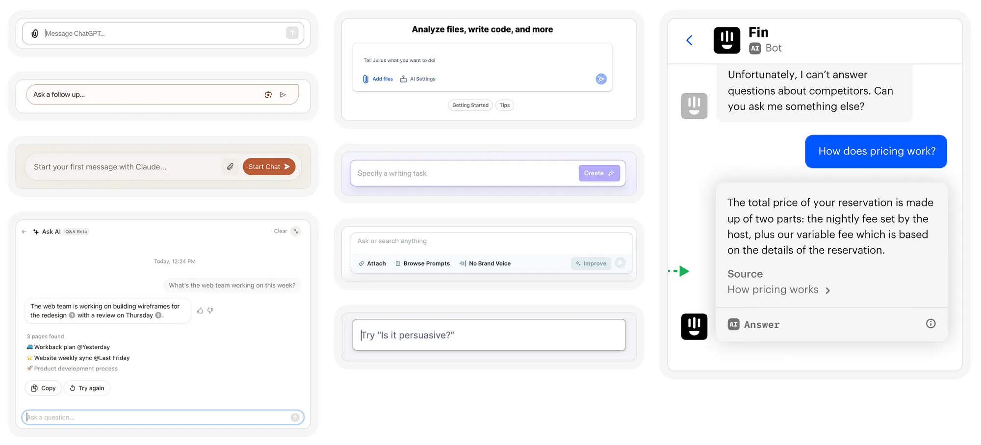 比如,在许多 AI 应用中,一个开放式的输入框可以充当“破冰者”,帮助用户开启对话。这种方式建立在已有的输入框模式上,而输入框本身已经是 UI 组件中的标准元素。但现在,它承担了新的角色——无论是 ChatGPT 的问答框,还是设计工具中的布局指令,这种方式既提供了灵活性,又能引导用户的意图,使交互更加直观。
