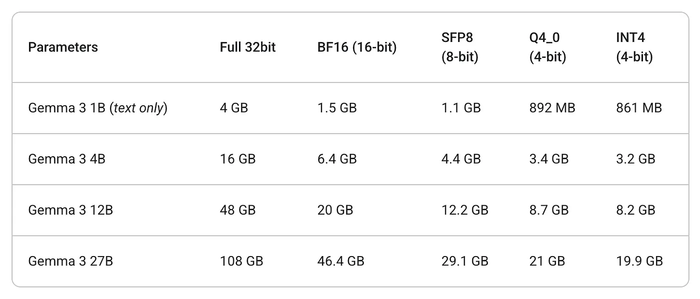 如果你计划在本地机器上运行它,以下是不同规模的 Gemma 3 模型版本在推理时的大致 GPU 或 TPU 内存需求。