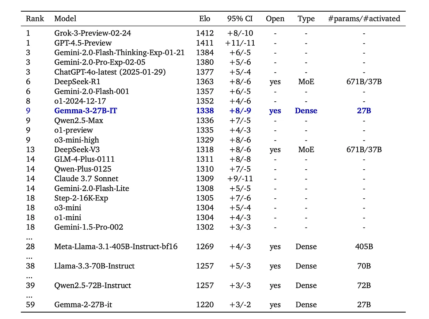 Gemma 3 与 Meta 的 Llama、DeepSeek、OpenAI 的 o1-preview 及其他模型的对比