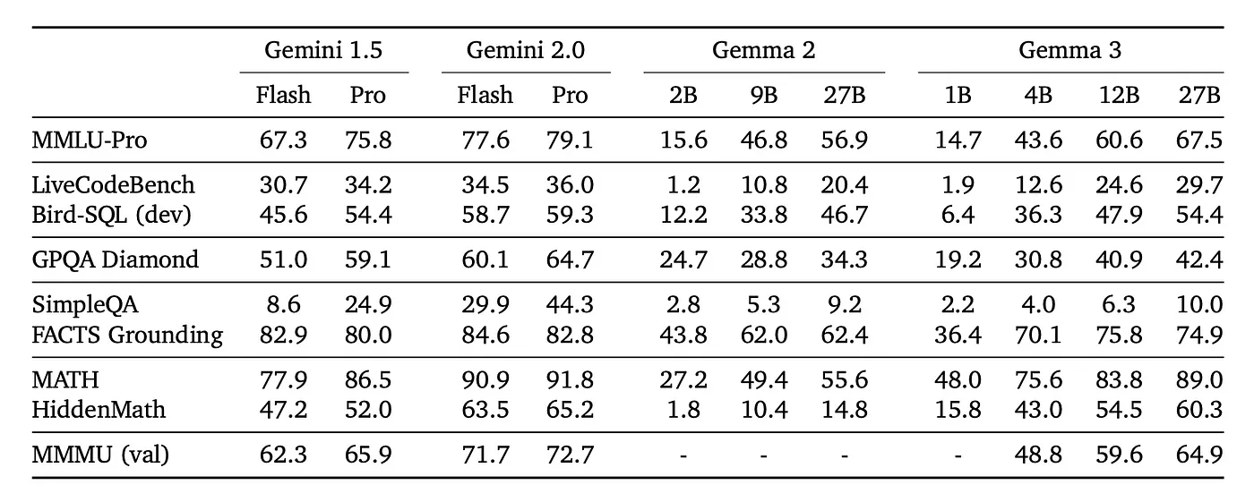 Gemma 3 与 Gemma 2 以及 Gemini 1.5 和 Gemini 2.0 的对比