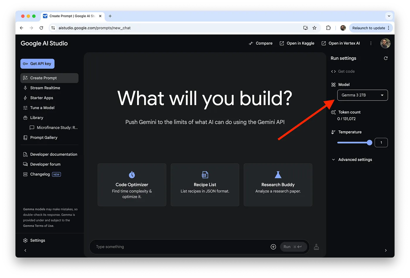 如果你只是想试用一下,Google AI Studio 允许你直接在浏览器中运行它,无需任何设置。访问 aistudio.google.com,然后将模型设置为‘Gemma 3 27B’。