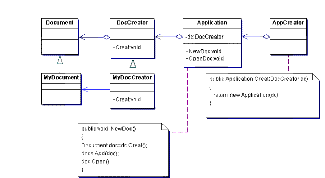 注意到了吗? Application就是一个Factory, 对于不同的Document我们需要扩展不同的Application然后override它们的CreateDocument方法. 然而Application仅仅是创建文档对象吗? 它还做了一系列的工作,将新建的文档对象添加到文档列表并打开文档. 并且还提供了一个完全和创建无关的打开文档(OpenDocument方法)的功能. 看看它和你想象中的创建者模式一样吗? 它可不是仅仅new 一个对象那么简单. 你注意到了吗? 我估计很多人都没有注意到这点, 甚至在吕震宇的文章中.(吕兄可别怪我 :P 谁叫你太有名了)