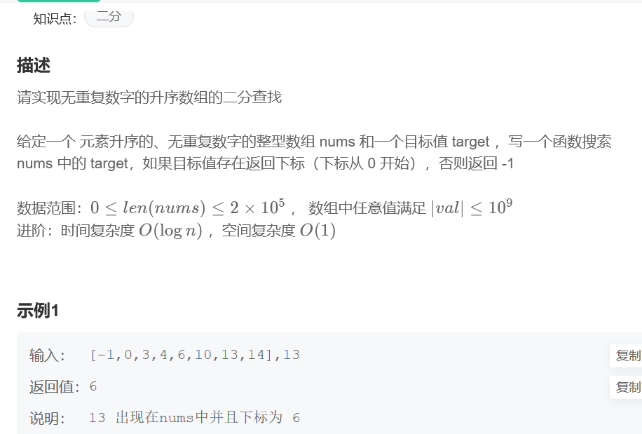 left = mid + 1;//当目标值小于中间点值时,按照题目升序的规律判断目标值如果存在一定在右边的区间里,把左边的指针更新为mid+1