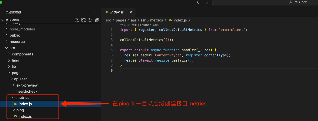 安装包prom-client,在ping同一目录层级创建接口api/ssr/metrics
