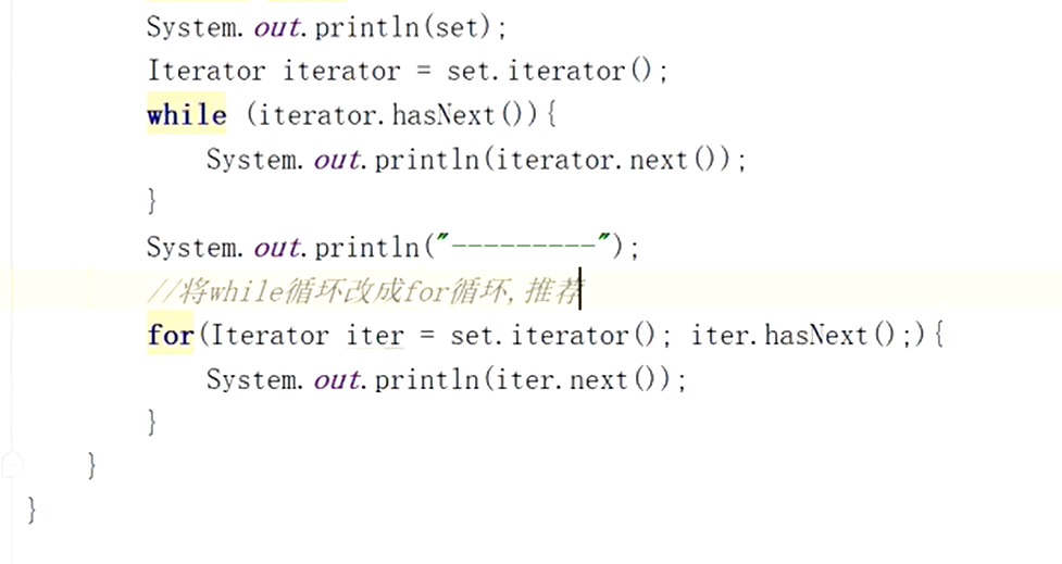 6、迭代器会维持到方法体结束,消耗内存空间。迭代器从创建一开始,一直到方法结束。所以建议用第二种方法。写在for 循环里作用域是这个循环内。