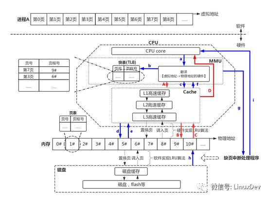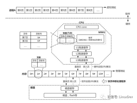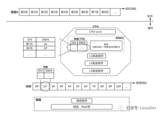 CPU需要访问进程的虚拟地址,于是把虚拟地址发送给MMU,由MMU内的硬件电路实现访问快表、页表,最终得到的物理地址。