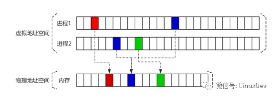 Linux内核只有在万不得已得情况下才会真正为进程分配物理内存。例如进程1中的白色部分,由于进程还没使用,因此白色部分并不会指向物理内存的页框。