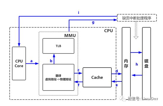 【f】MMU从高速缓存中获取页表项,发现虚拟地址没分配物理页框,触发缺页中断