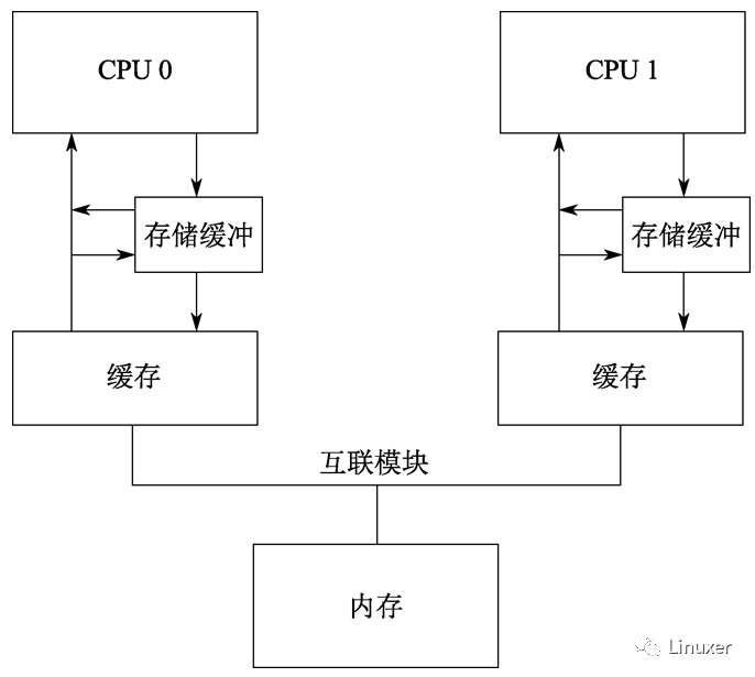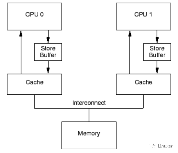 对于特定CPU来说,这些Write buffer是属于本地的。或者在硬件多线程系统中,它对于特定核来说,是属于本地的。无论哪一种情况,一个特定CPU仅仅允许访问分配给它的Writebuffer。例如,在上图中,CPU 0不能访问CPU 1的存储缓冲,反之亦然。