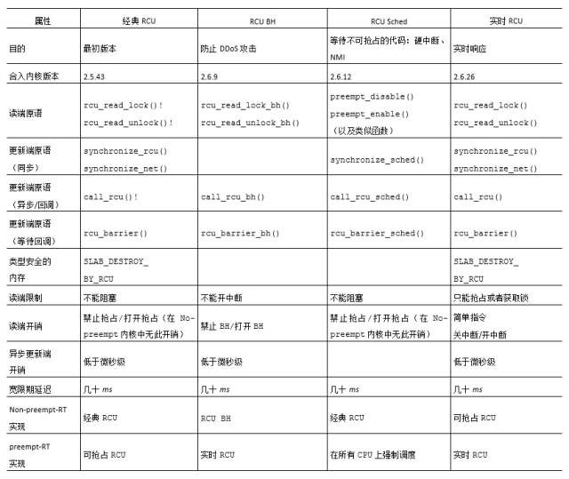 RCU的优点在于:性能、不会死锁,以及良好的实时延迟。当然RCU也有一点缺点,比如:读者与更新者并发执行,低优先级RCU读者也可以阻塞正等待优雅周期(Grace Period)结束的高优先级线程,优雅周期的延迟可能达到好几毫秒。