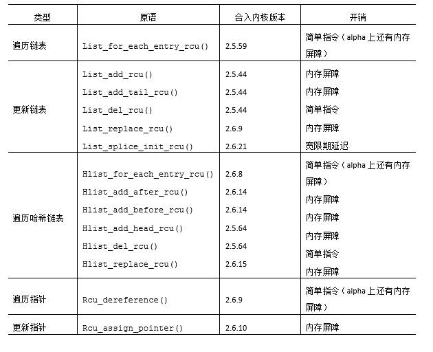 表中的第一类API作用于Linux的struct list_head循环双链表。list_for_each_ entry_rcu()原语以类型安全的方式遍历受RCU保护的链表。在非Alpha的平台上,该原语相较于list_for_each_entry()原语不产生或者只带来极低的性能惩罚。list_add_rcu()、list_add_tail_rcu()和list_replace_rcu()原语都是对非RCU版本的模拟,但是在弱顺序的机器上回带来额外的内存屏障开销。list_del_rcu()原语同样是非RCU版本的模拟,但是奇怪的是它要比非RCU版本快一点,这是由于list_del_rcu()只毒化prev指针,而list_del()会同时毒化prev和next指针。最后,list_splice_init_rcu()原语和它的非RCU版本类似,但是会带来一个完整的优雅周期的延迟。