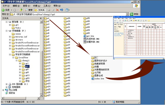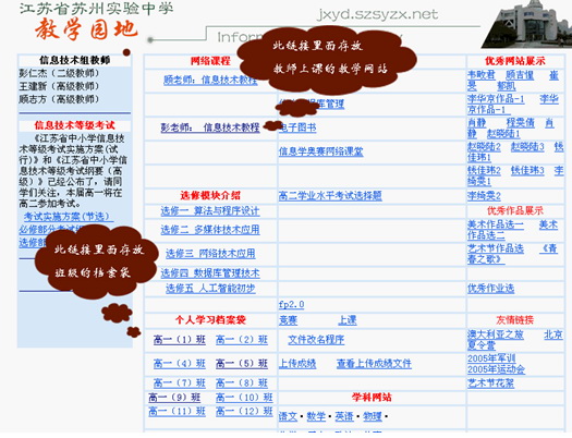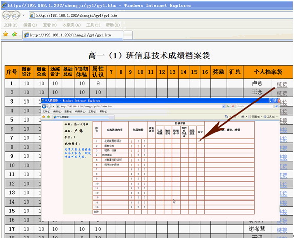 在教师网站上有每个班级的成绩表,每位学生的名字后面都有一个链接,连接到映射盘里面的网页文件,学生只要把做好的可执行文件连接到网页上,教师和其他学生就可以看到该名学生的作品了。如图: