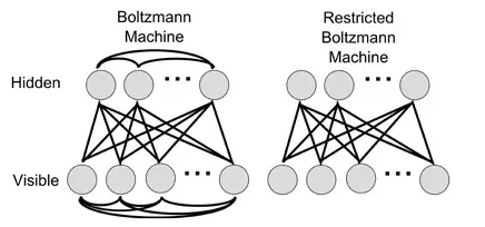 在这篇论文里, Hinton 在算法上的核心,是借用了统计力学里的"玻尔兹曼分布"的概念 (一个微粒在某个状态的几率,和那个状态的能量的指数成反比, 和它的温度的倒数之指数成反比), 使用所谓的"限制玻尔兹曼机" (RBM)来学习.