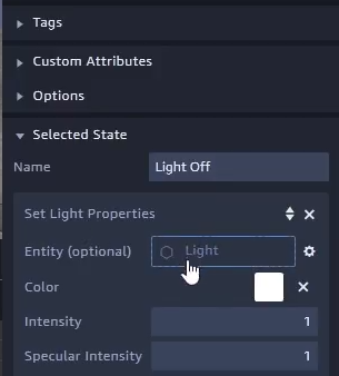 5. Add action: Set Light Properties (drag light Entities from left sidebar to Entity option)