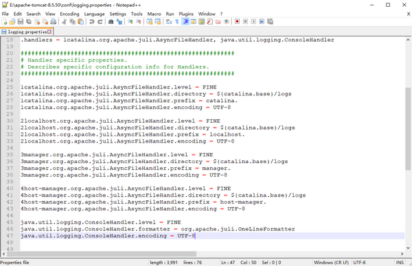 - 步骤一:打开tomacat目录中的conf/logging.properties,配置编码全部为UTF-8