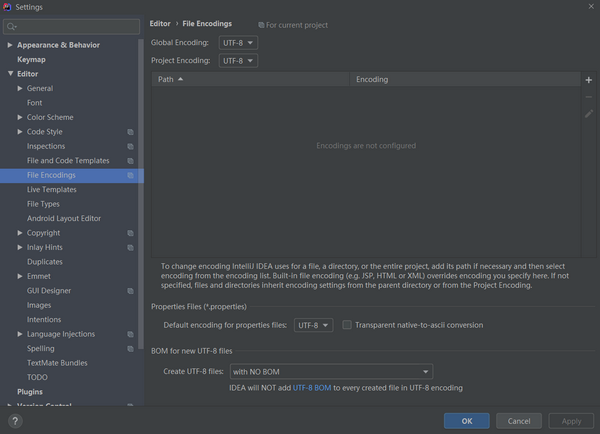 - 步骤二:打开IDEA的窗口中的File/Settings.../Editor/File Encodings,配置编码全部为UTF-8