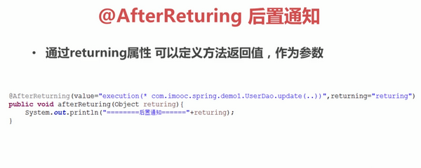 <aop:after-returning method="afterReturning" pointcut-ref="pointcut2" returning="result"/>