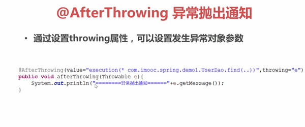@AfterThrowing(value = "execution(* com.jesse.aspectj.demo1.ProductDao.findOne(..))" ,throwing = "e")