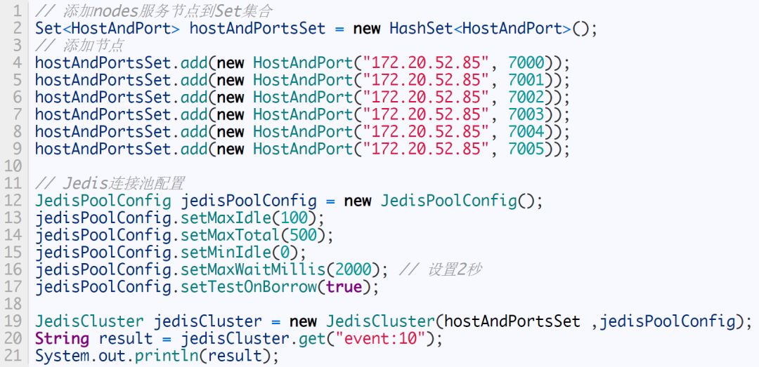 使用JedisCluster对redis-cluster进行数据操作的参考代码如下: