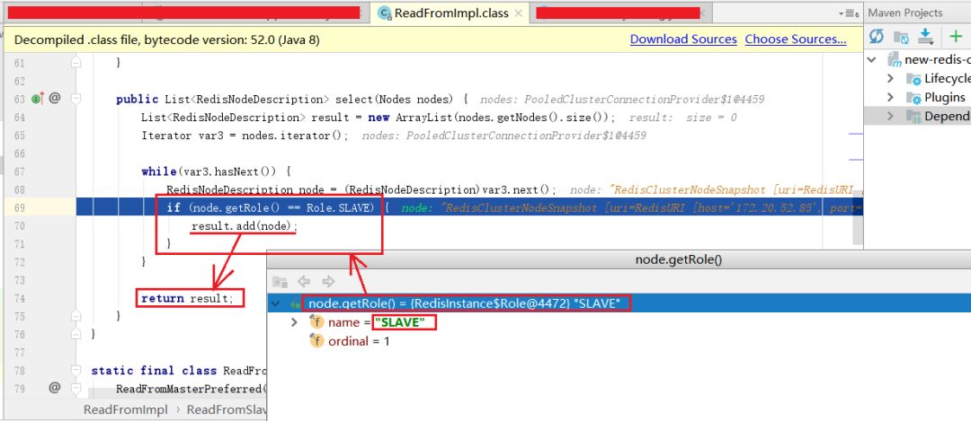 带着疑问,我们可以开通debug模式,在redisClusterConnection.sync().get(“event:10”)等类似的获取数据的代码行上面打上断点。通过代码的走查,我们可以看到,在ReadFromImpl类中,最终会select到key所在的slave节点,进行返回,并在该slave中进行数据的读取: