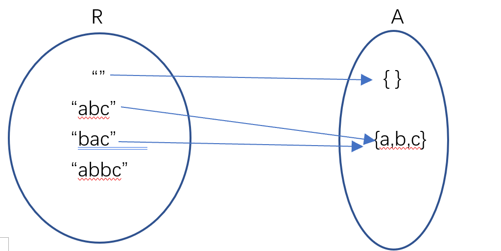 AF可能有满射、未必单射、未必双射三种情况,但是尽量不要出现未必单射的情况,否则在判断对象是否相等时会很麻烦,因为判断对象是否相等是从客户的角度来说。下面是一个例子,在这当中就出现了未必单射的情况。这是因为表示不是一种严格的编码,有不止一种方法将无序字符表示成字符串。