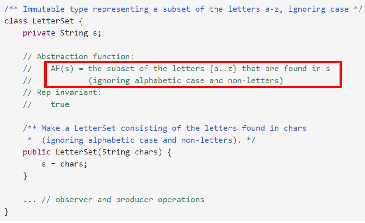 先来用AF判相等,ADT的AF写道忽略字母情况和非字母的,所以根据这个映射关系,第一个、第二个和第五个是等价的。如果考虑观察者等价性,我们查看ADT的方法可以发现,这个类只有constructor没有observer,所以这个类的任何两个对象都具有观察者等价性,也就是我们无法利用观察者等价性。