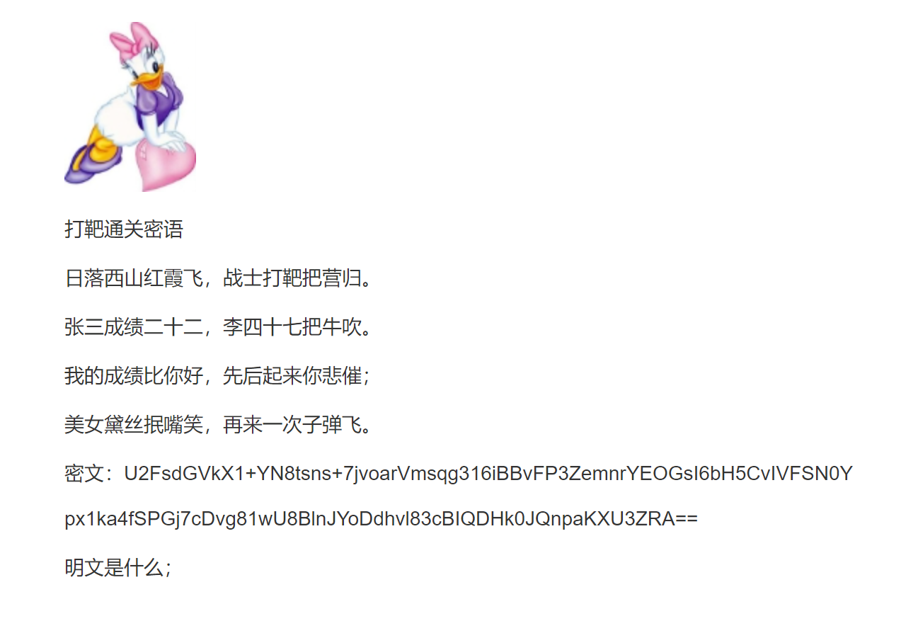 第三句可知密钥是65312−35635=29677。依旧是DES,解得 xxaqdl(p25-12-bstring)U2FsdGVkX199XCqgBzG3McJ1NuWuuPclqBS9lekxPpE 也就是信息安全第二十五页第十二行二进制字符串01000011