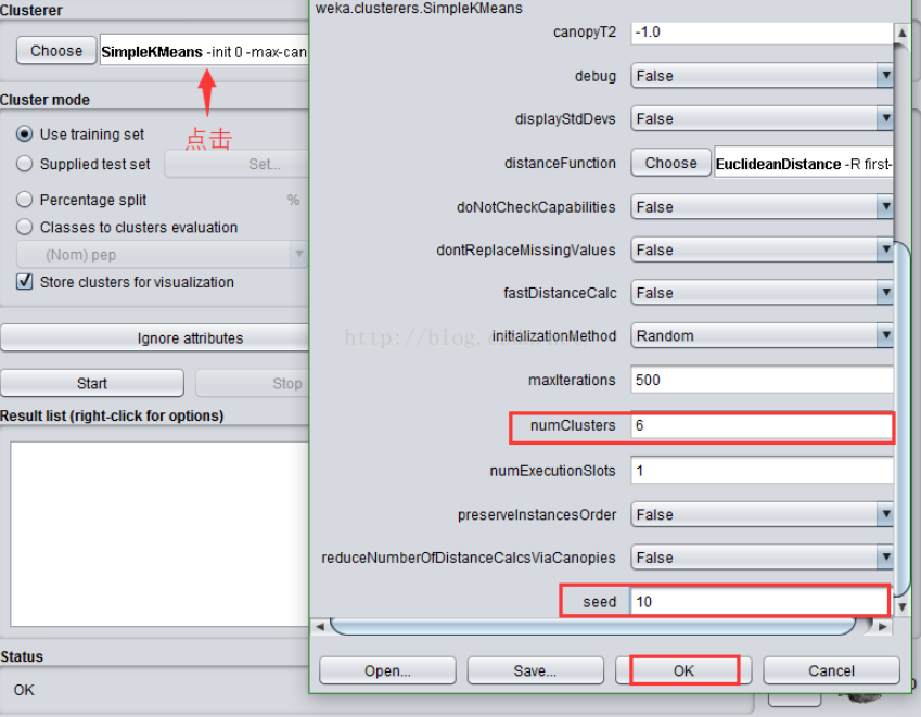 点击“Choose”旁边的文本框,修改“numClusters”为6,说明我们希望把这768条实例聚成6类,即K=6;下面的“seed”参数是要设置一个随机种子 ,依此产生一个随机数 ,用来得到K均值算法中第一次给出的K个簇中心的位置。我们不妨暂时让它就为10,点击OK。