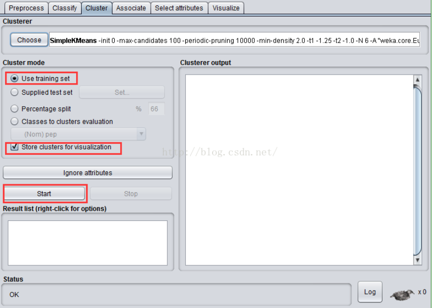 选中“Cluster Mode”的“Use training set”(使用训练集),选择“Store clusters for visualization”(存储聚类可视化),点击“Start”按钮。