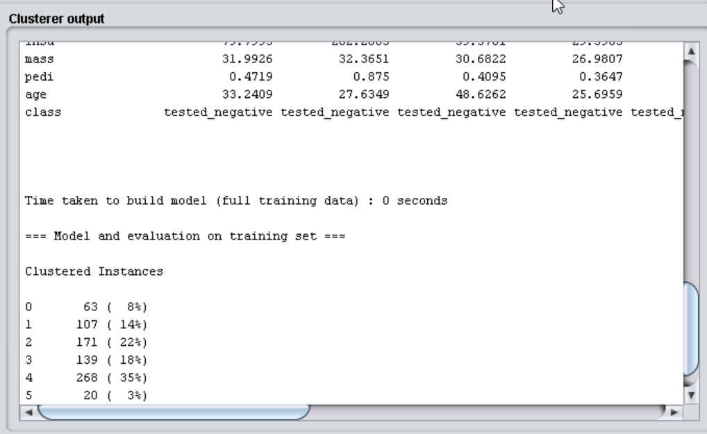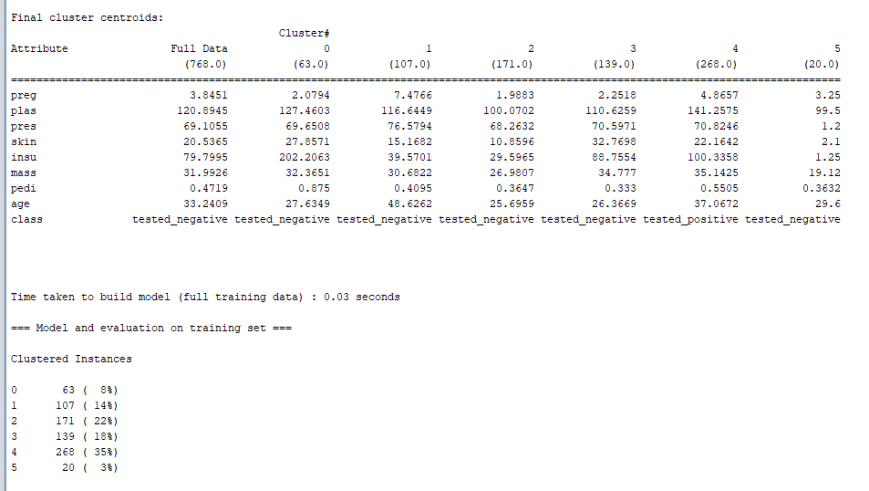 对于数值型的属性,簇中心就是它的均值(Mean);对于分类型的属性,簇中心就是它的众数(Mode),也就是说这个属性上取值为众数值的实例最多;对于数值型的属性,还给出了该属性在各个簇中的标准差(Std Devs)。比如第一行数据为“preg”的属性,后面的几列数据分别代表其在所有数据和6个簇中的簇中心数值,下面的几行则是其他属性对应的簇中心数值。如下图所示: