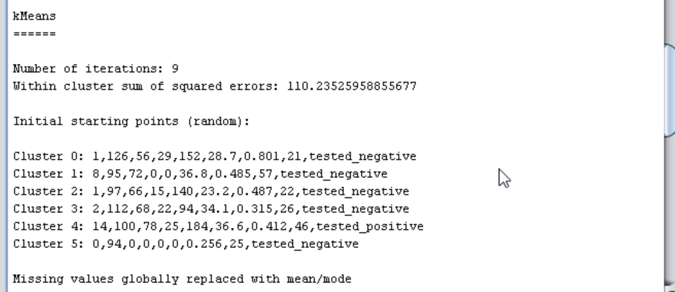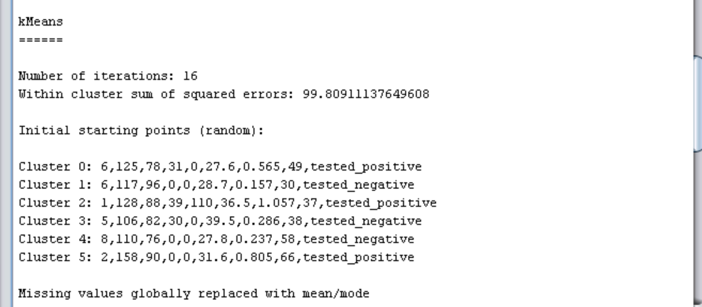 将“seed”值修改为“20”,再次运行。观察结果,可以发现: Within cluster sum of squared errors: 99.80911137649608,与上面的运行过程相比数值变小。