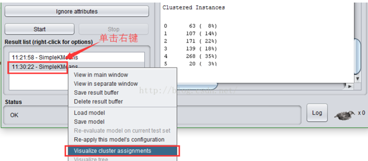 为了观察可视化的聚类结果,我们在左下方“Result list”列出的结果上右击,点“ Visualize cluster assignments”。