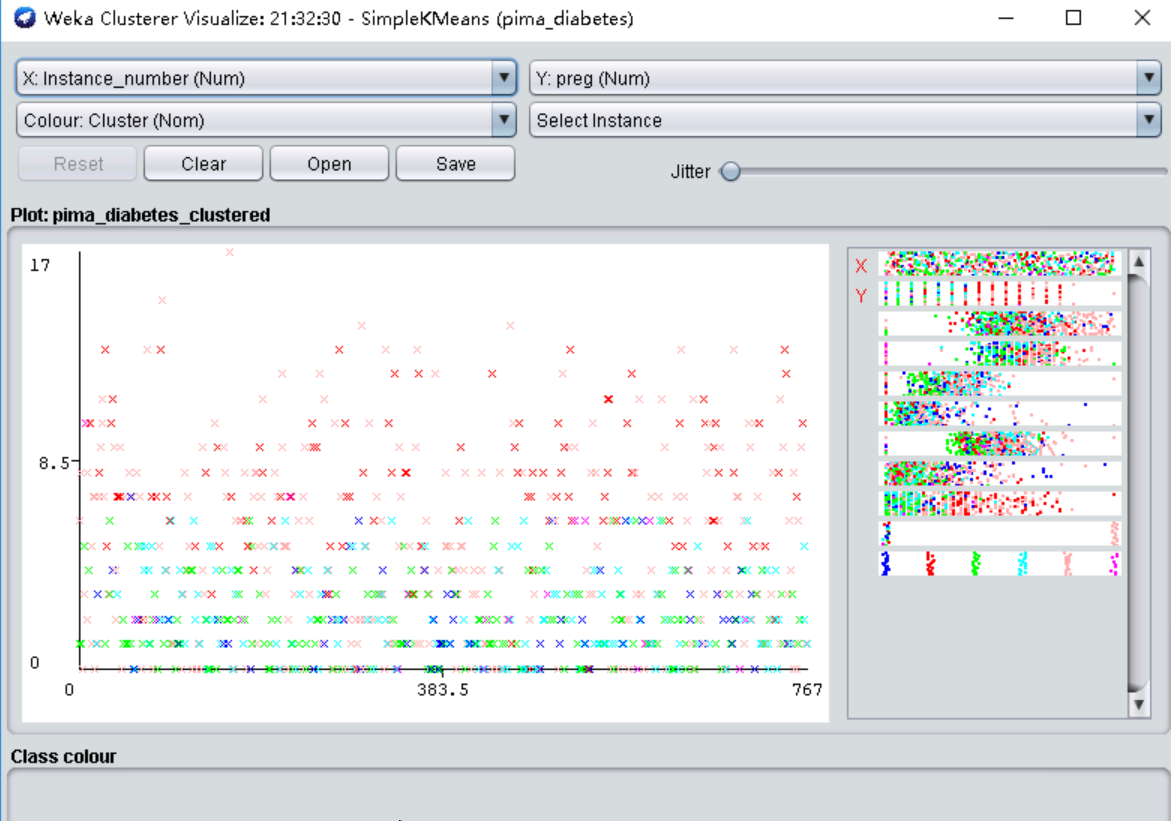 弹出的窗口给出了 各实例的散点图。最上方的两个框是选择横坐标和纵坐标,第二行的“color”是散点图着色的依据,默认是根据不同的簇“Cluster”给实例标上不同的颜色。可以在这里点“Save”把聚类结果保存成ARFF文件。