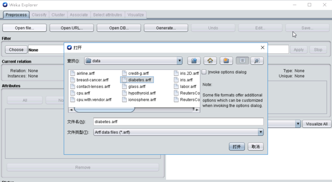 点击“Open file”选项,查找到Weka目录下的“data”文件夹,找到其中的“diabetes.arff”文件,点击右下角的打开选项。