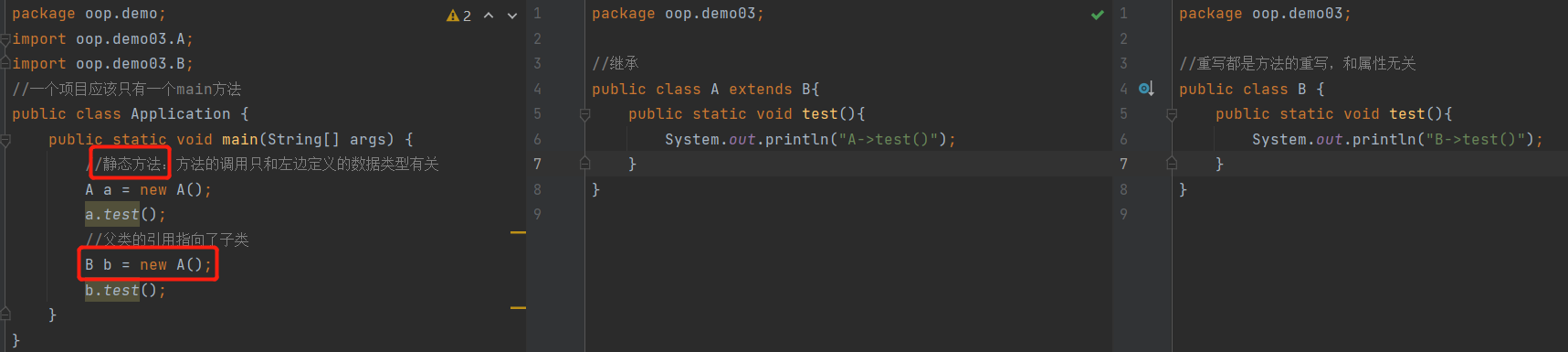 (1)在静态方法中:方法的调用只和左边定义的数据类型有关,但是没有重写方法