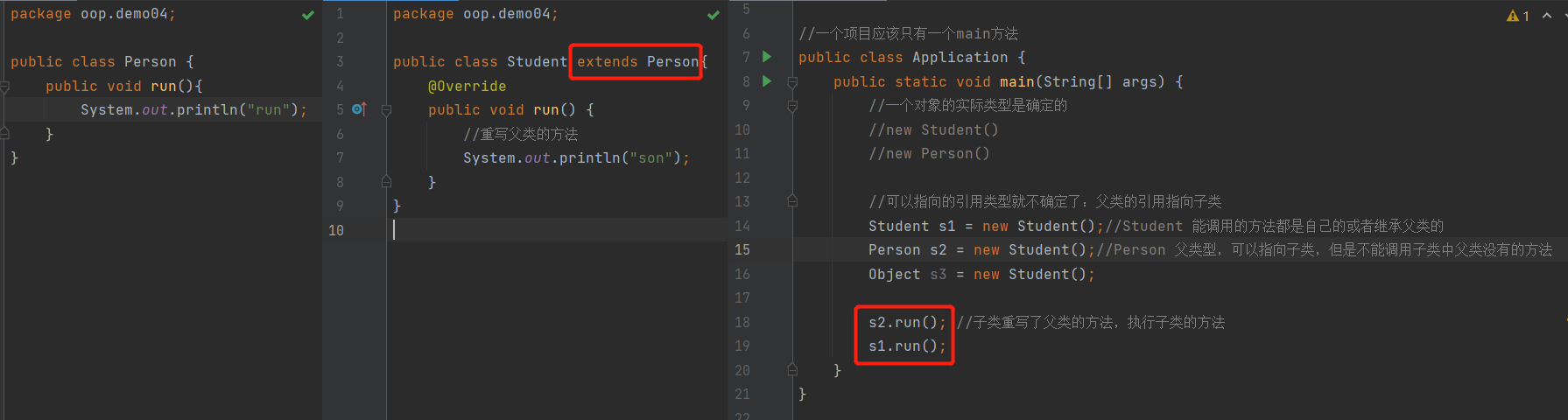 - 存在条件:继承关系,方法需要重写,父类引用指向子类对象! Father f1 = new Son();