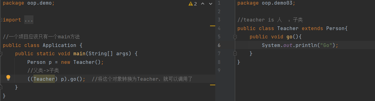 父类可以调用子类方法,但是不能调用子类中父类没有的方法,这时我们可以通过类型转换来进行调用,通过父类和子类之间的类型转换