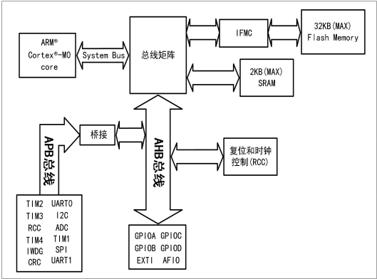 此总线连接 Cortex™-M0 内核的系统总线(外设总线)到总线矩阵,总线矩阵协调内核与外部总线的访问。