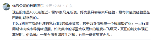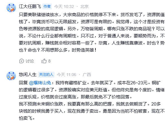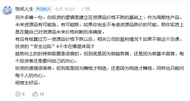 不过除了商业互吹,还有个争论很有趣。一个人提醒,贴主的成功经验,是建立在矿物价格会一直上涨的预期上的,必须要考虑不涨的情况。但贴主认为大的趋势就是放水,上涨是趋势。