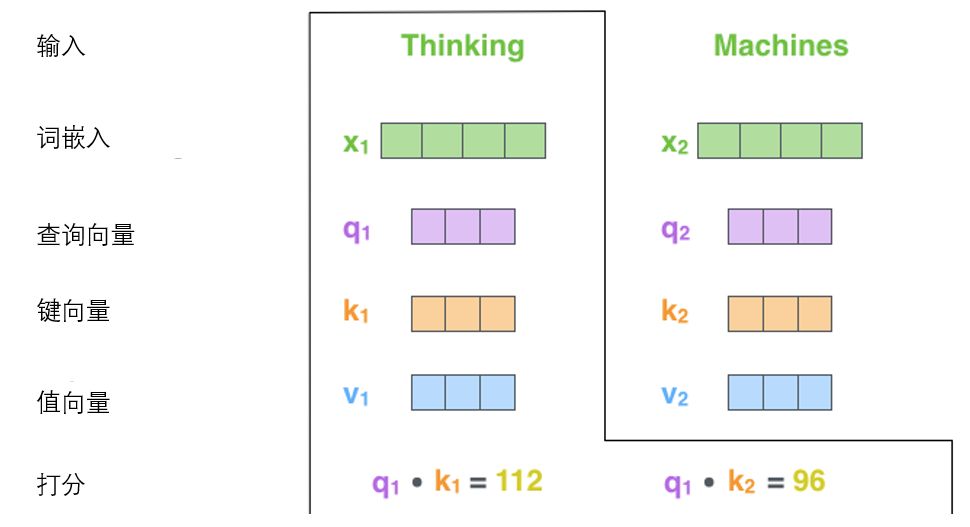 X1与WQ权重矩阵相乘得到q1, 就是与这个单词相关的查询向量。最终使得输入序列的每个单词的创建一个查询向量、一个键向量和一个值向量。