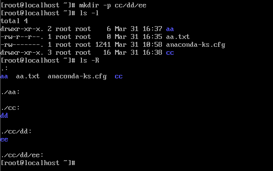 # mkdir -p cc/dd (-p 父目录不存在情况下先生成父目录[parents])(当前目录创建)