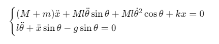 dx2 = (k*x - c*dx + m*l*dtheta^2*sin_theta - m*g*sin_theta*cos_theta) / denom;