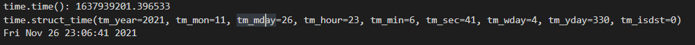 time.struct_time(tm_year=2021, tm_mon=11, tm_mday=26, tm_hour=23, tm_min=6, tm_sec=41, tm_wday=4, tm_yday=330, tm_isdst=0)