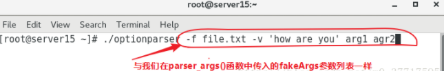 注意:我们对optParser.parser_args()函数传入参数列表和没有传入参数列表的区别。在上述使用fakeArgs参数列表代替了我们在命令行输入的参数。如果我们在shell中运行这个代码,会如此传参: