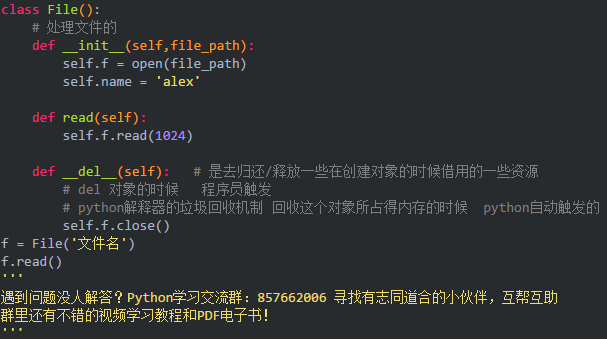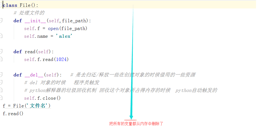 不管是主动还是被动,这个f对象总会被清理掉,被清理掉就触发__del__方法,触发这个方法就会归还操作系统的文件资源
