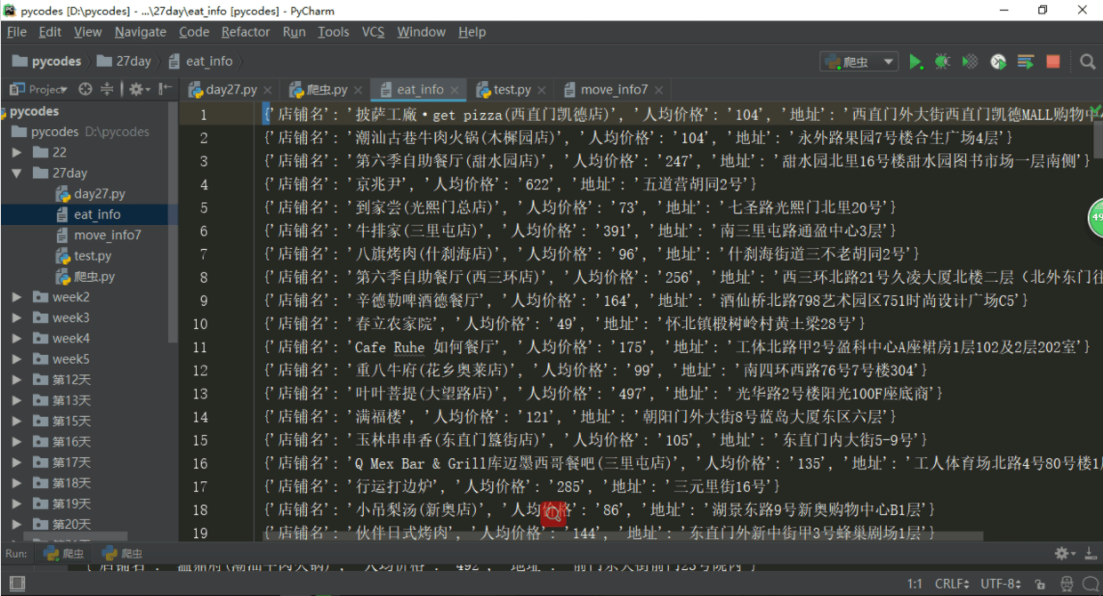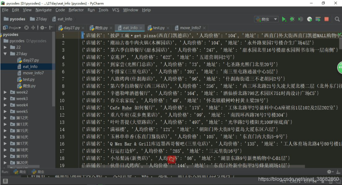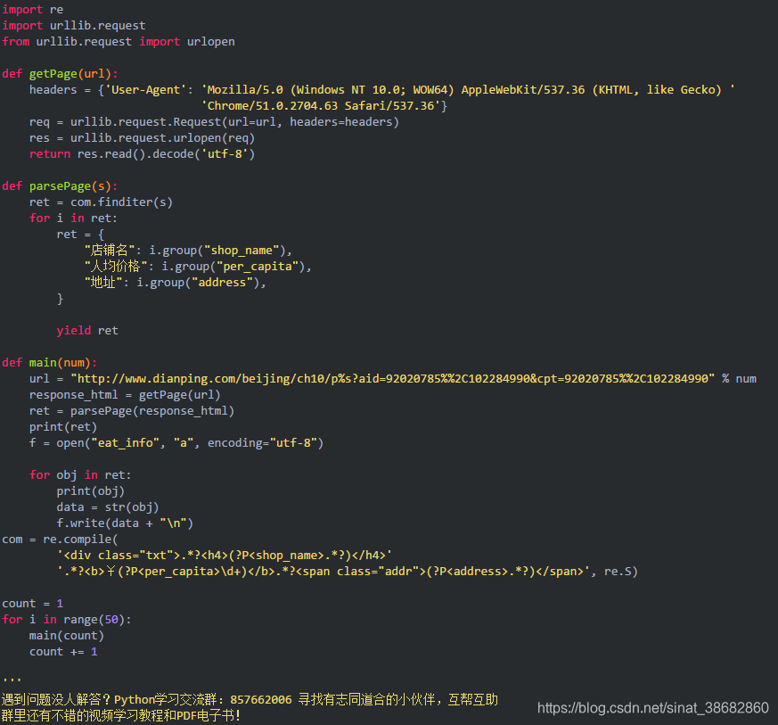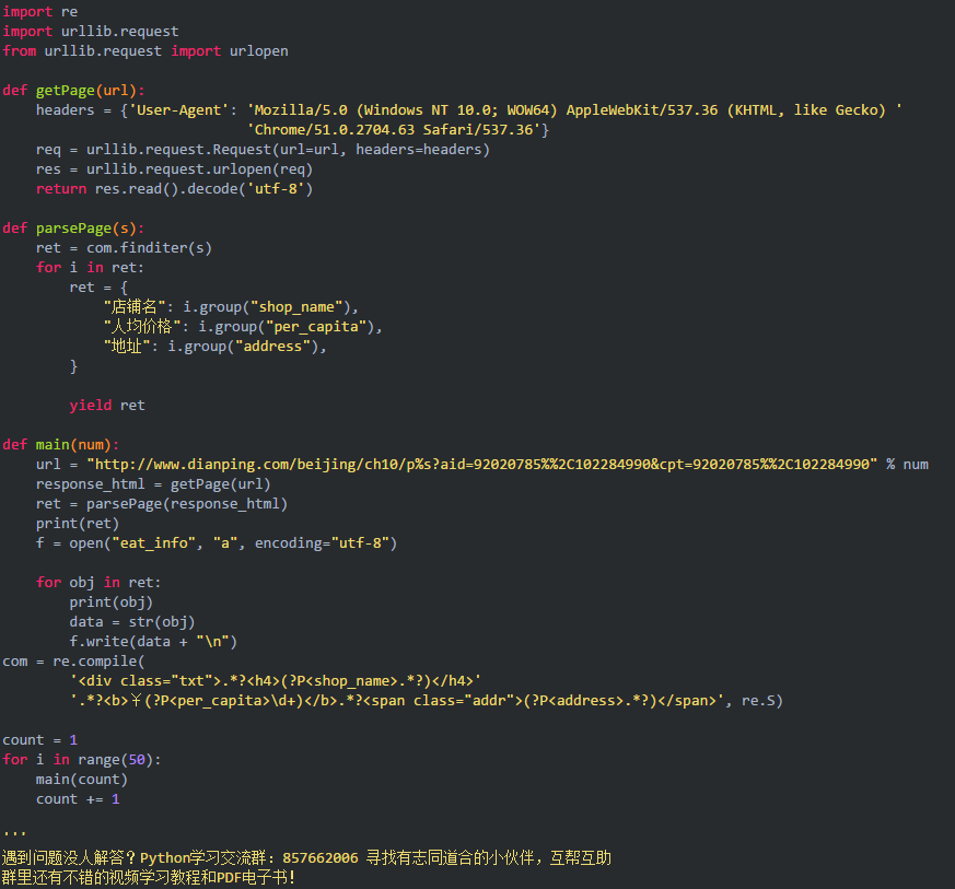 今天根据正则表达式简单的爬了一下大众点评,把北京的美食爬了爬,(店铺名,人均消费,地址)