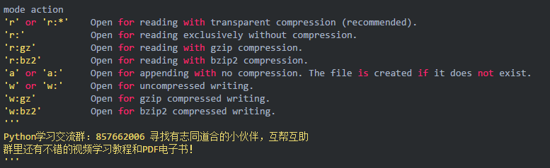 tarfile.open的mode有以下种,每种对应不同的方式,需要根据自己需要选取: