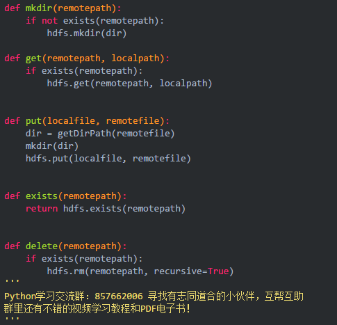 如果想要上传文件等到hdfs,必须保证其文件夹存在,否则会报错,此时就可以先创建文件夹,只需要使用hdfs.mkdir(dir)即可,并且此命令会递归创建文件夹,即不需要一层层的创建不存在的文件夹。